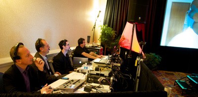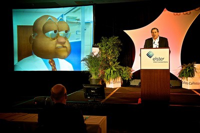 Dr. Cal was played by Gary Jesch, from a closet near the hotel ballroom, as part of a production headed by Doug Edelson of Feats, Inc. and crewed by Doug Kerswell’s GMS Media. His first appearance on the stage screen was with Joe Orlando, an Elster Solutions executive, who introduced Buster.