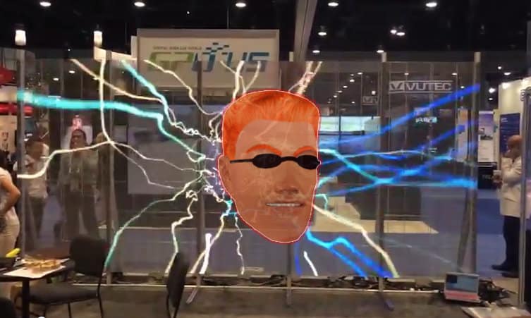 In the scene above, CHOPS or one of our other avatars appears on the semi-transparent background, integrated with video graphics or still shots, and can be visible from large distances in nearly any environment.