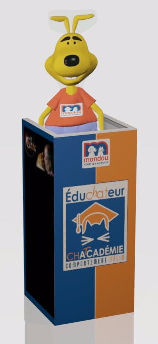 This kiosk built by INT-AR-ACT for Mondou features Pooch, our pet avatar and he’s projected onto a thin screen cut-out that matches his shape. He’s able to greet retail customers and speak about the product as well as any sales person in the store. In fact, it’s a sales person in the store who is controlling Pooch from “behind the curtain,” and who can bring his own personality and sense of humor to a fun situation that catches people off-guard.
